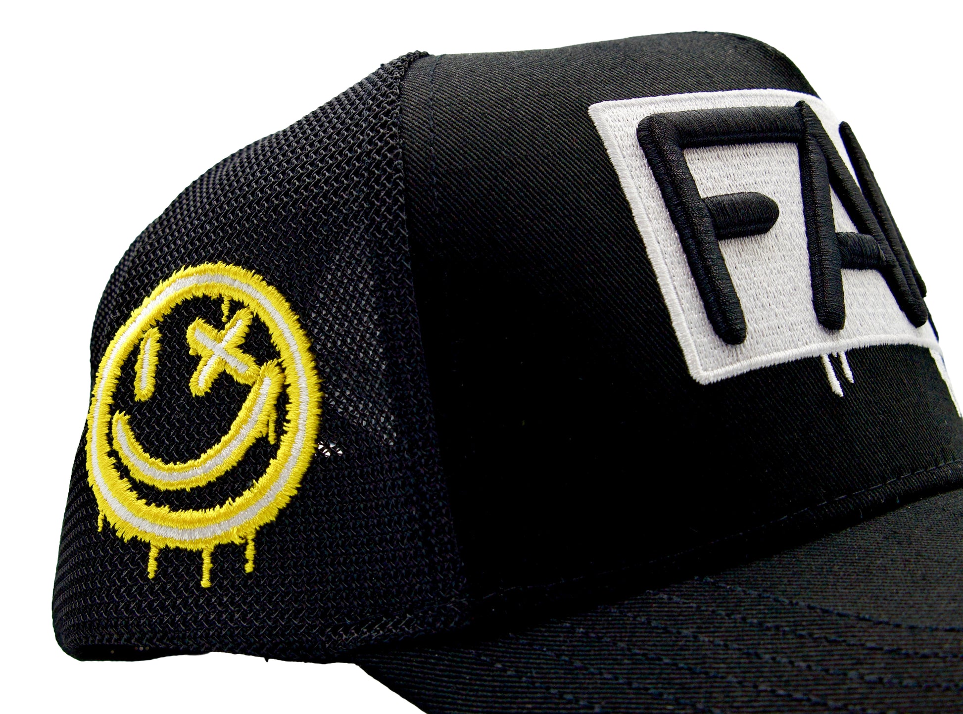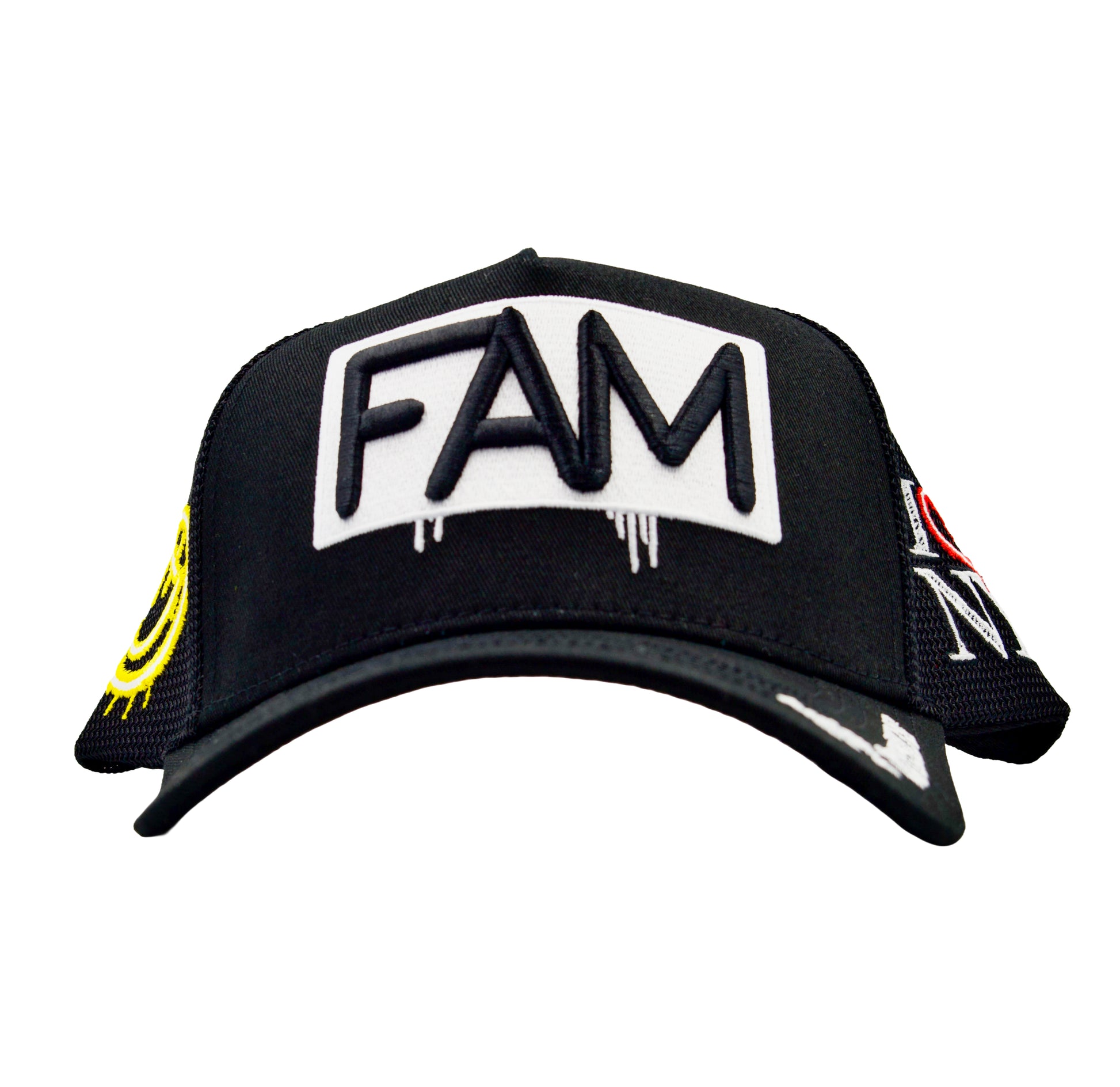 This is the second version of our FAM NYC Hats by Andaluz The Artist. Very limited run. These hats have 5 areas of high end embroidery with a high profile structure. On the brim it says WE OUTSIDE because that's facts. On the right side we have a new iteration of the I LOVE NY sign in neon colors. On the right side we have the classic NYC smiley face in neon lights. It doesn't get more NY then this.